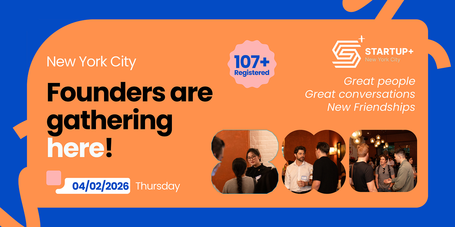 A room full of founders, operators, and builders. April 2 at Sour Mouse in NYC. Join the Startup+ crowd.